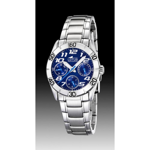 Caja Acero inoxidable. Diametro de caja 32 milímetros. Correa de acero con cierre de seguridad. Calendario Esfera color negro con tres esferas adicionales, día de la semana numérico, día de la semana, reloj formato 24h. Movimiento de cuarzo analógico. W.R. 50 m.